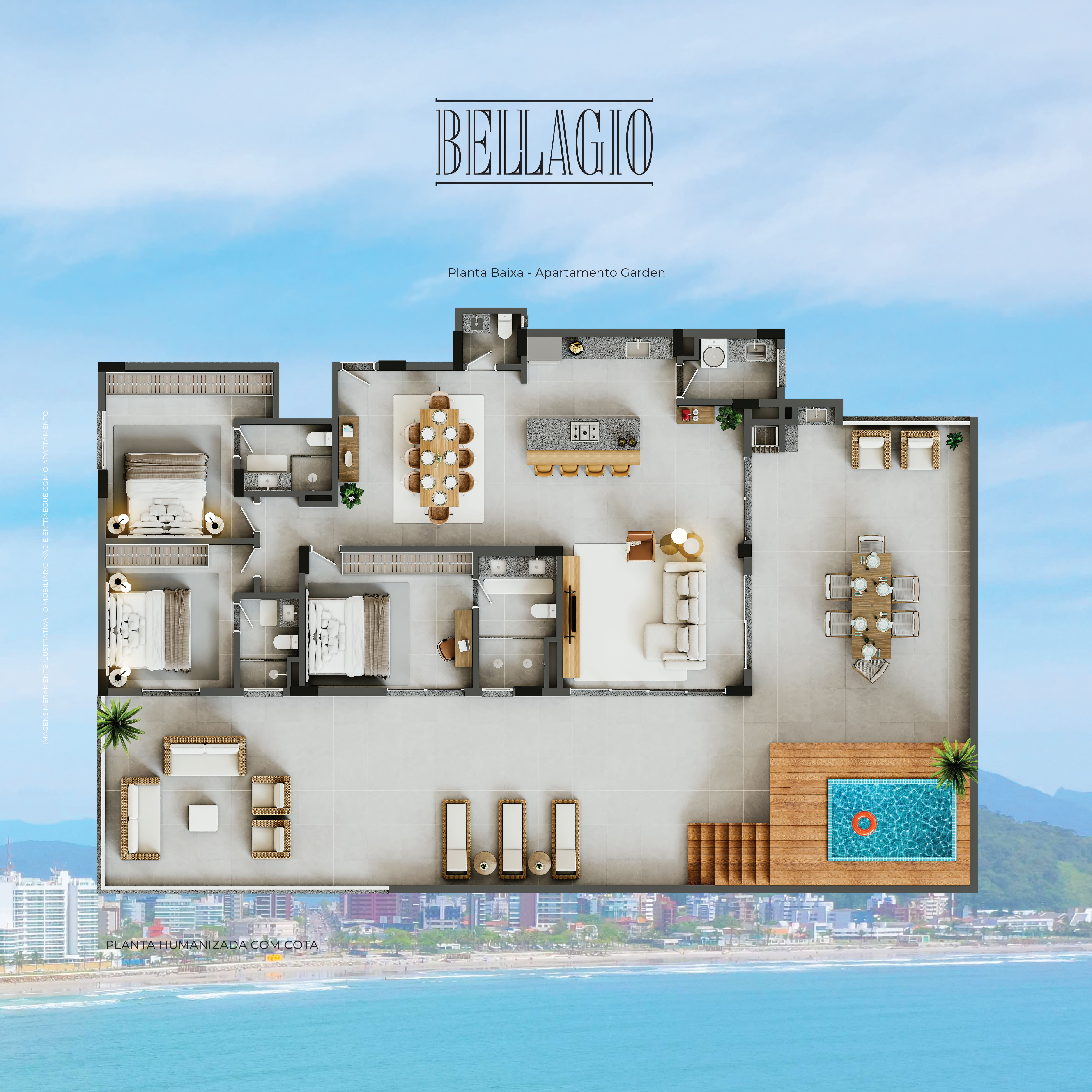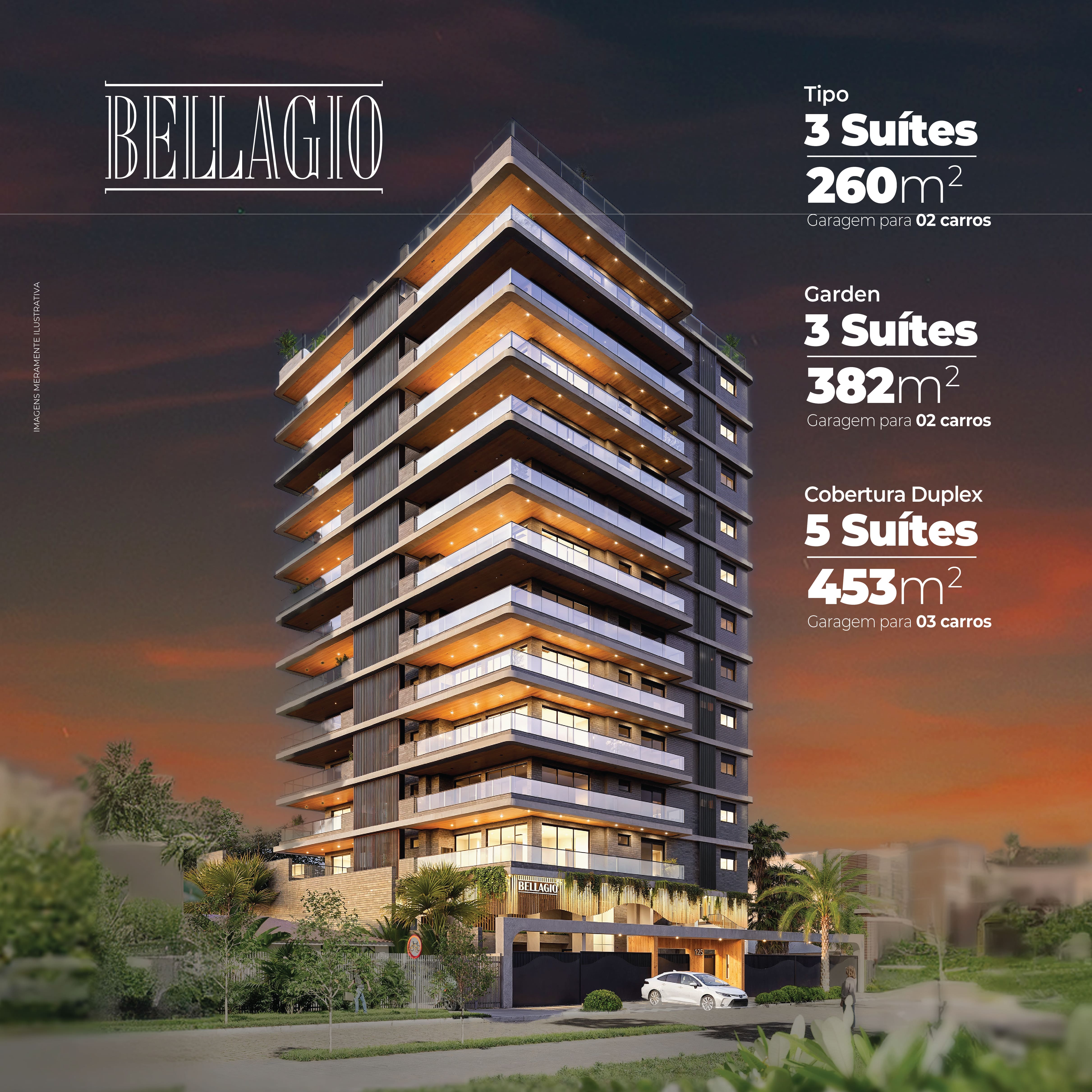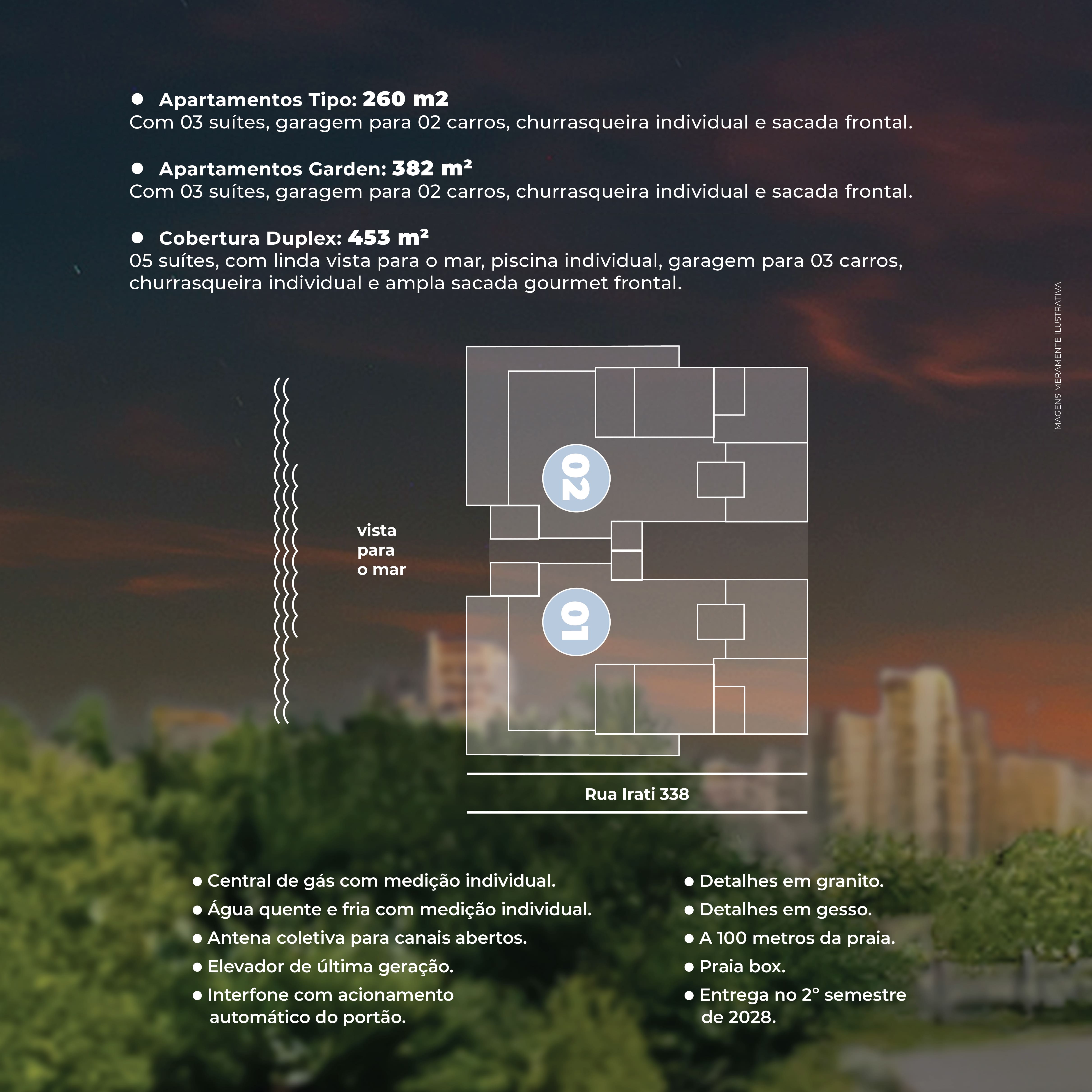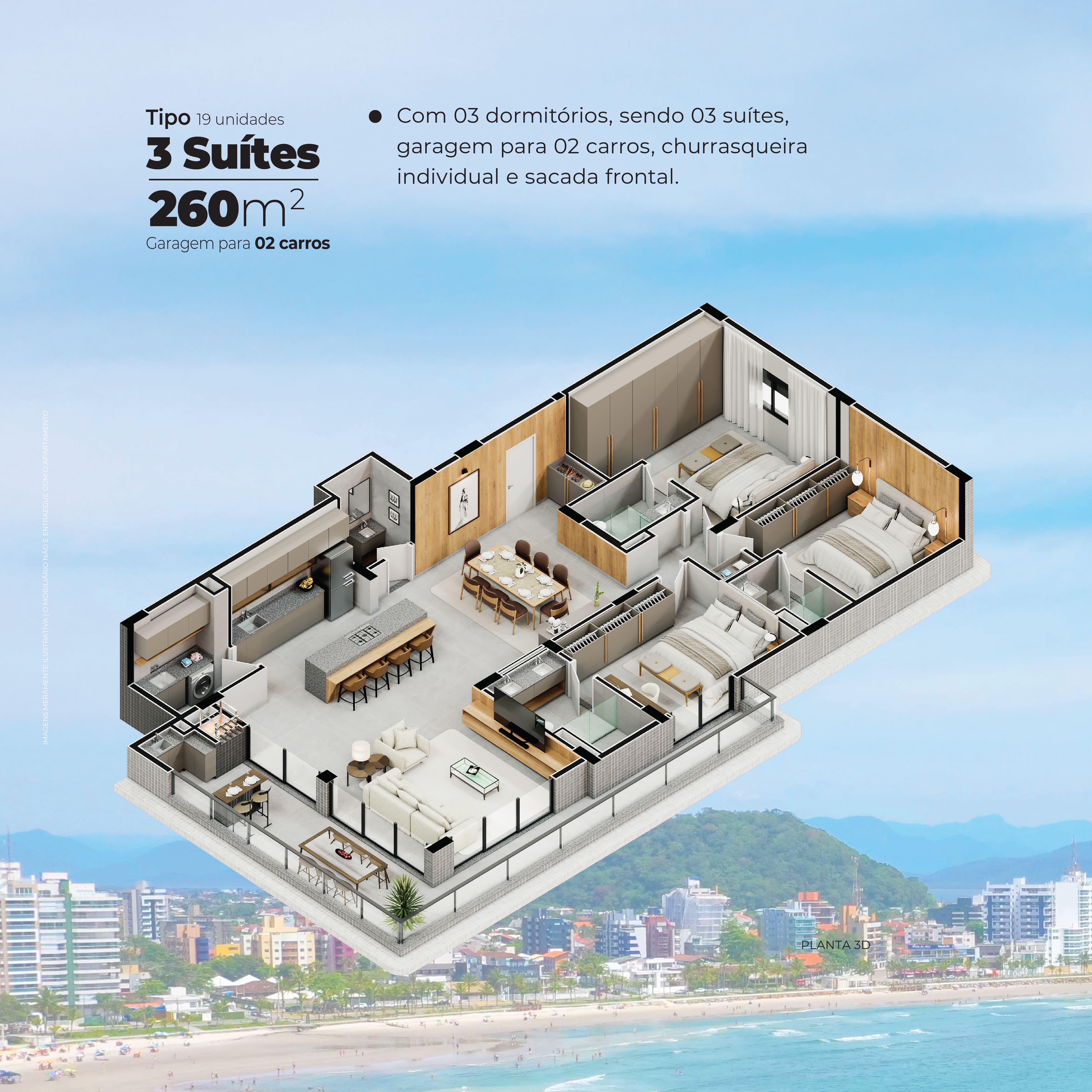 Apartamentos Tipo: 260 m² - Com 03 suítes, garagem para 02 carros, churrasqueira individual e sacada frontal.