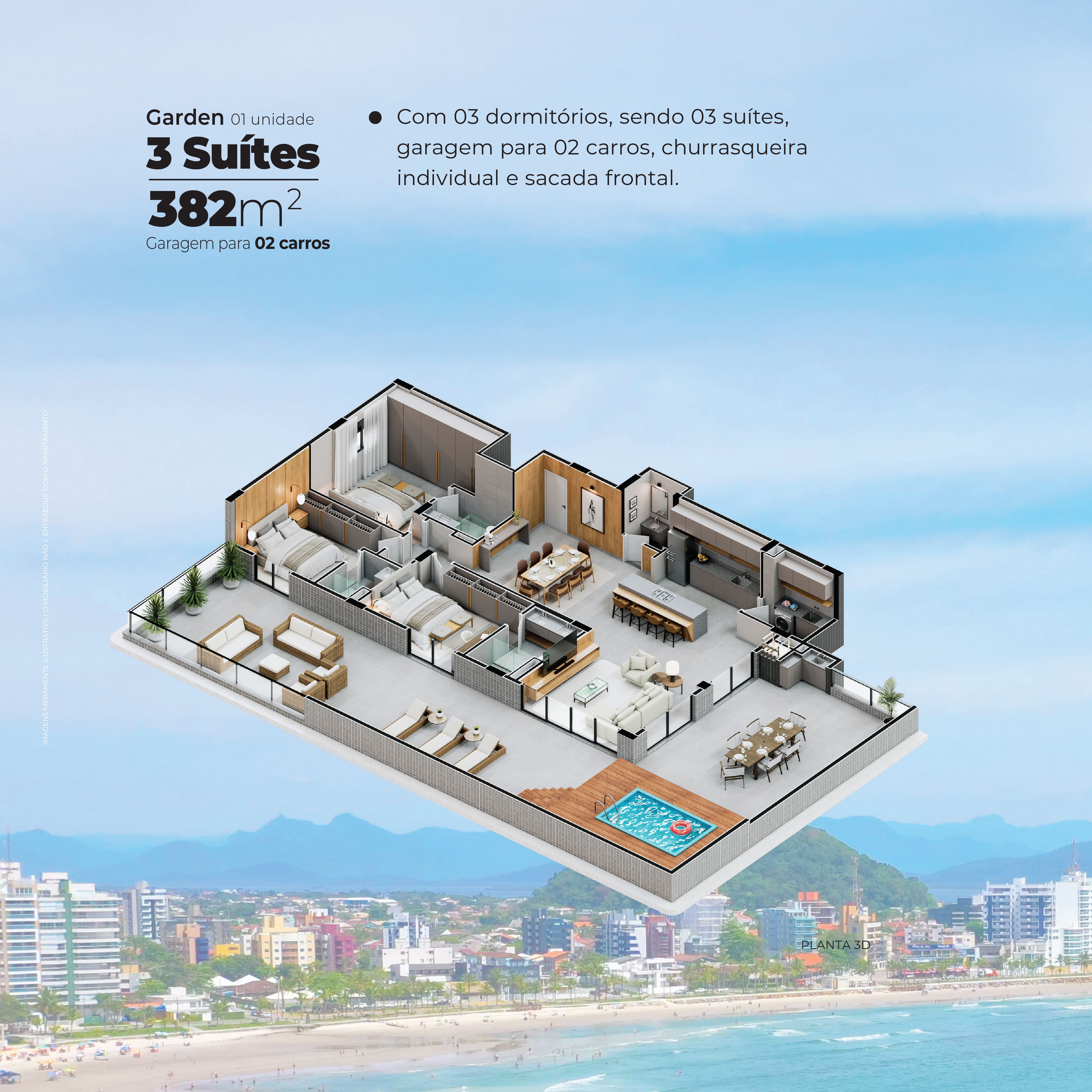 Garden: 382 m² - Com 03 suítes, garagem para 02 carros, churrasqueira individual e sacada frontal.