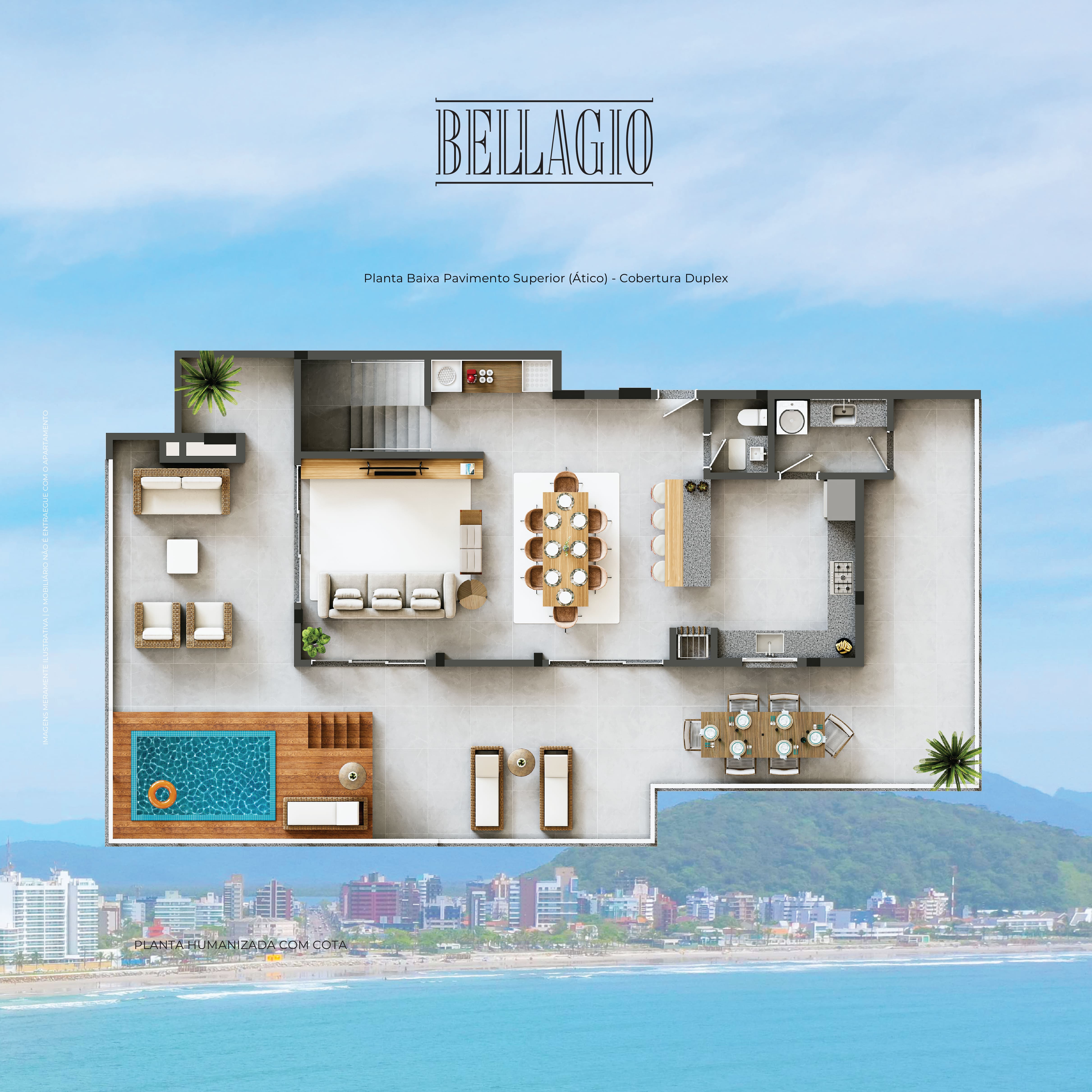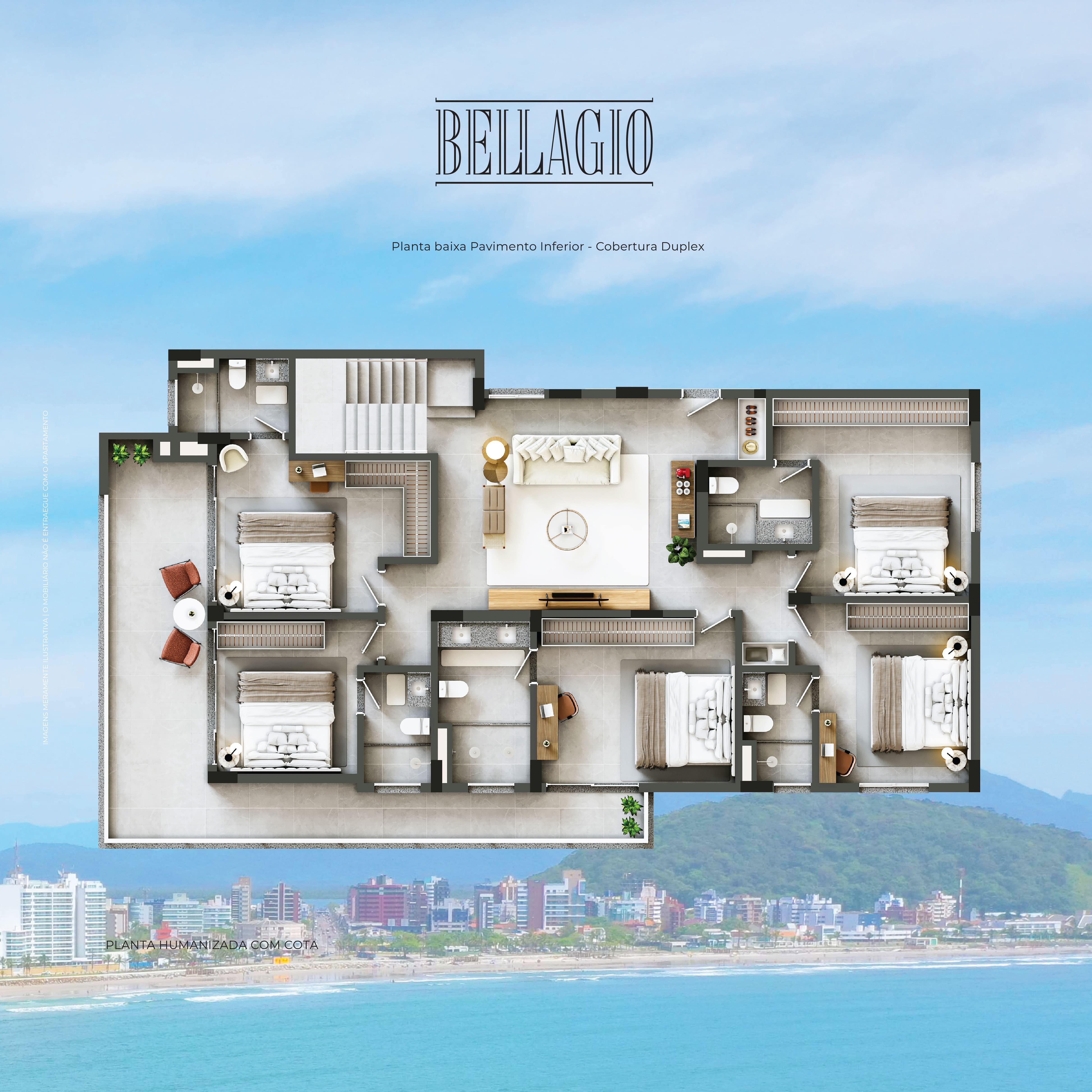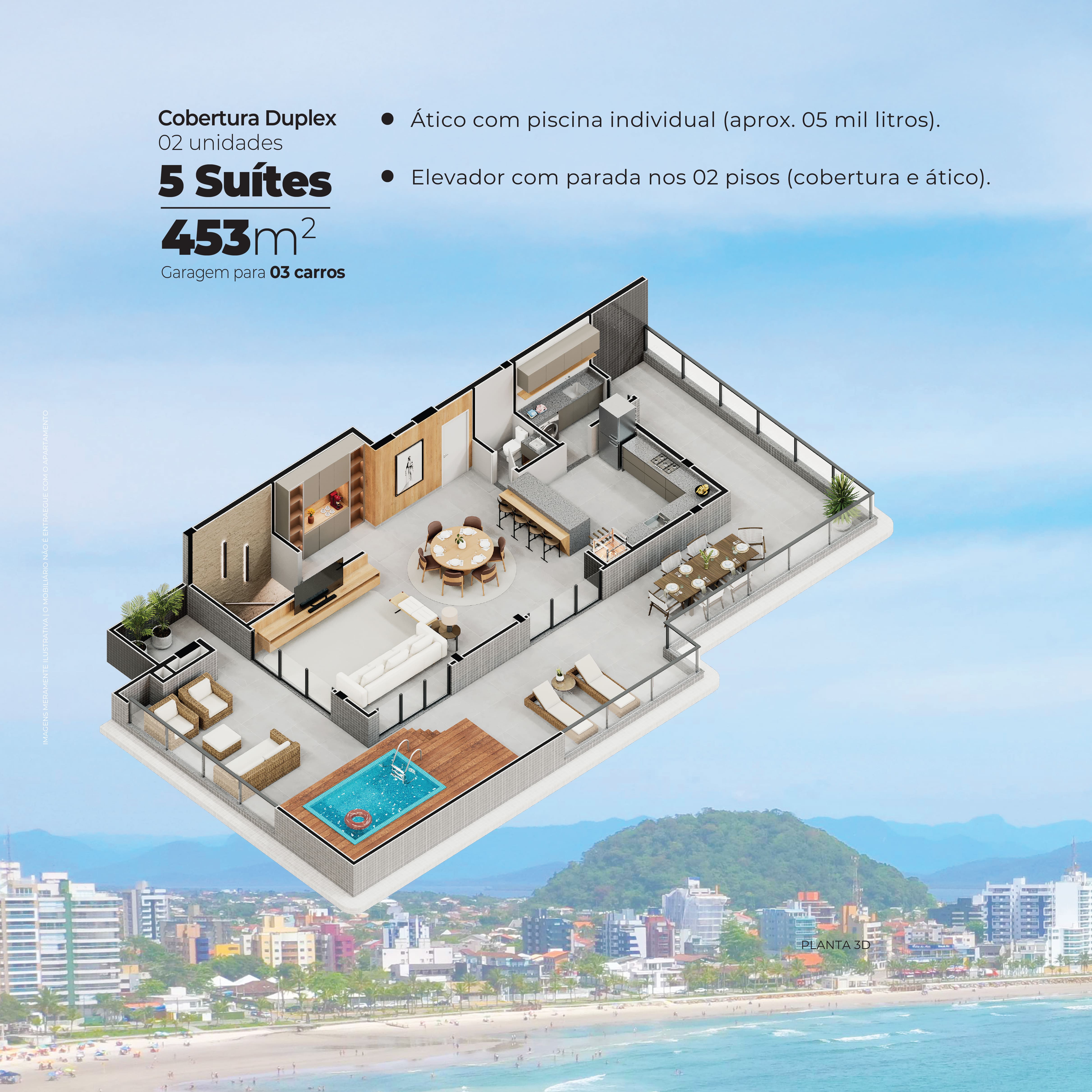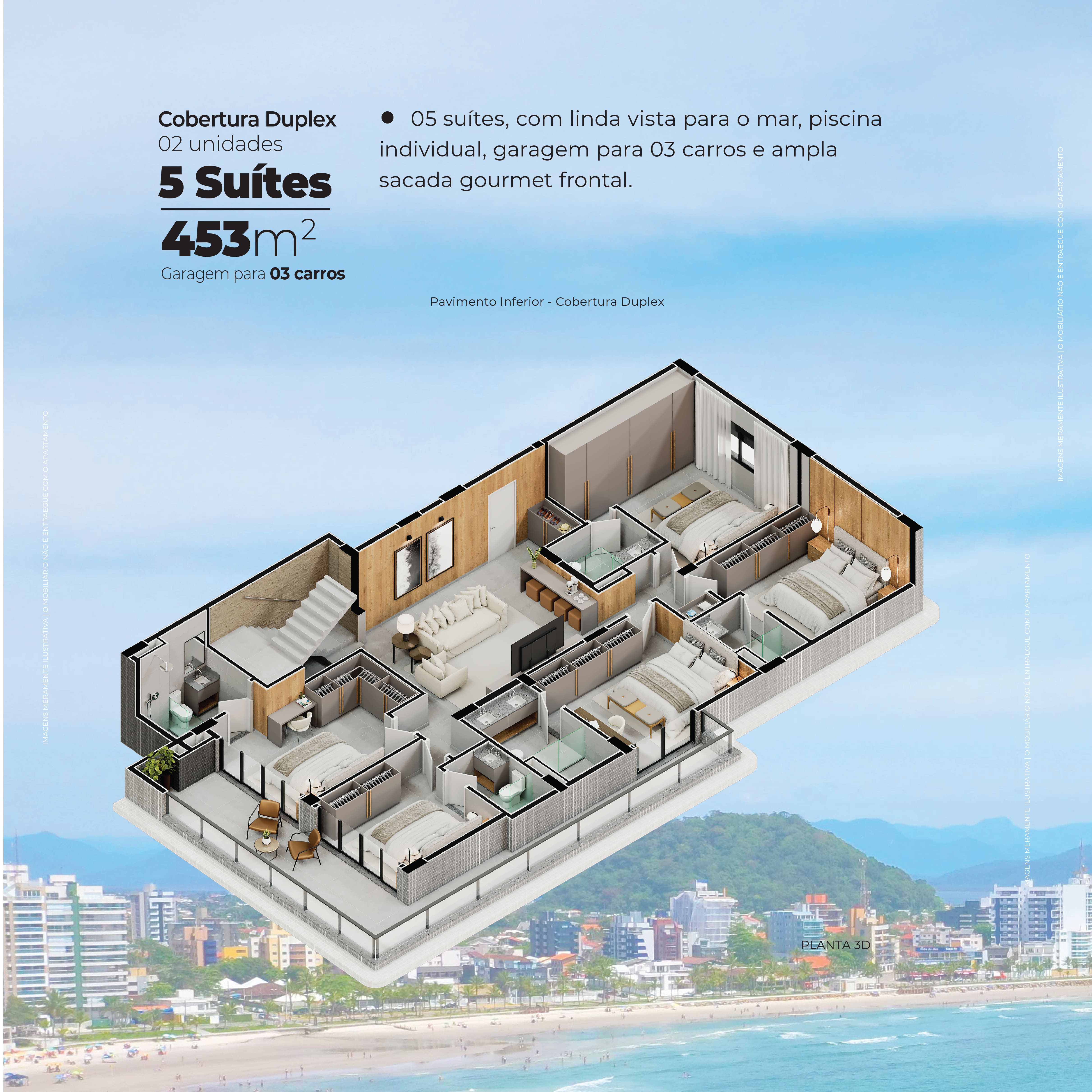 Duplex: 453 m² - 05 suítes, com linda vista para o mar, piscina individual, garagem para 03 carros, churrasqueira individual e ampla sacada gourmet frontal.